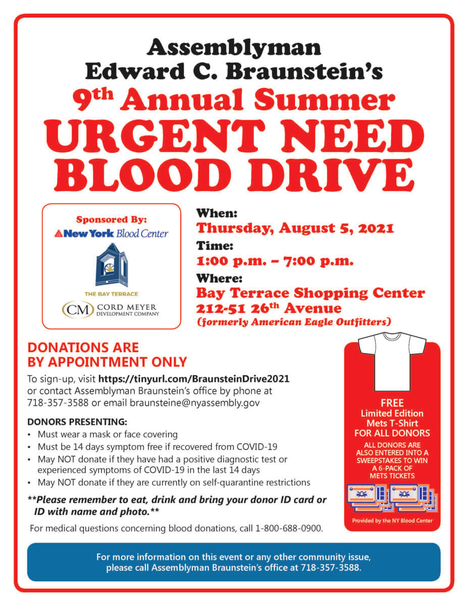 Next month, Assemblyman Edward Braunstein will host the Ninth Annual Summer Blood Drive in collaboration with the New York Blood Center. The event takes place at The Bay Terrace shopping center at 212-51 26th Ave. (formerly American Eagle Outfitters) on Thursday, Aug. 5, from 1 to 7 p.m.