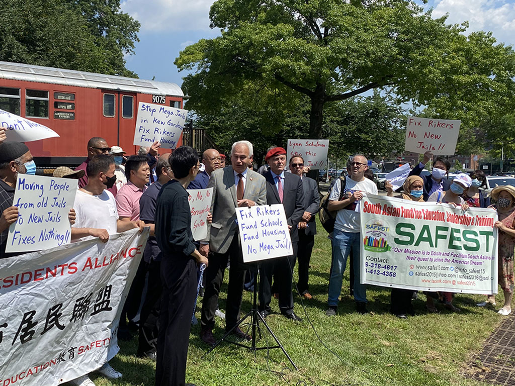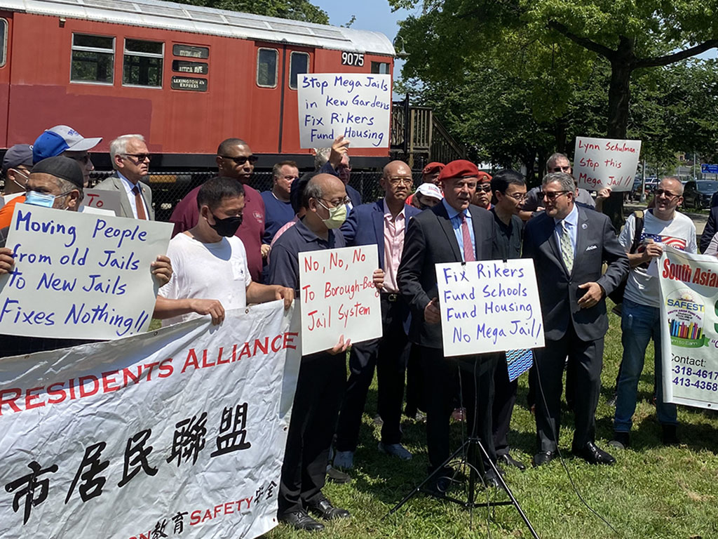 More than three dozen community members and leaders from across Queens gathered on Friday, Aug. 6, to protest the construction of a controversial community-based jail in Kew Gardens.