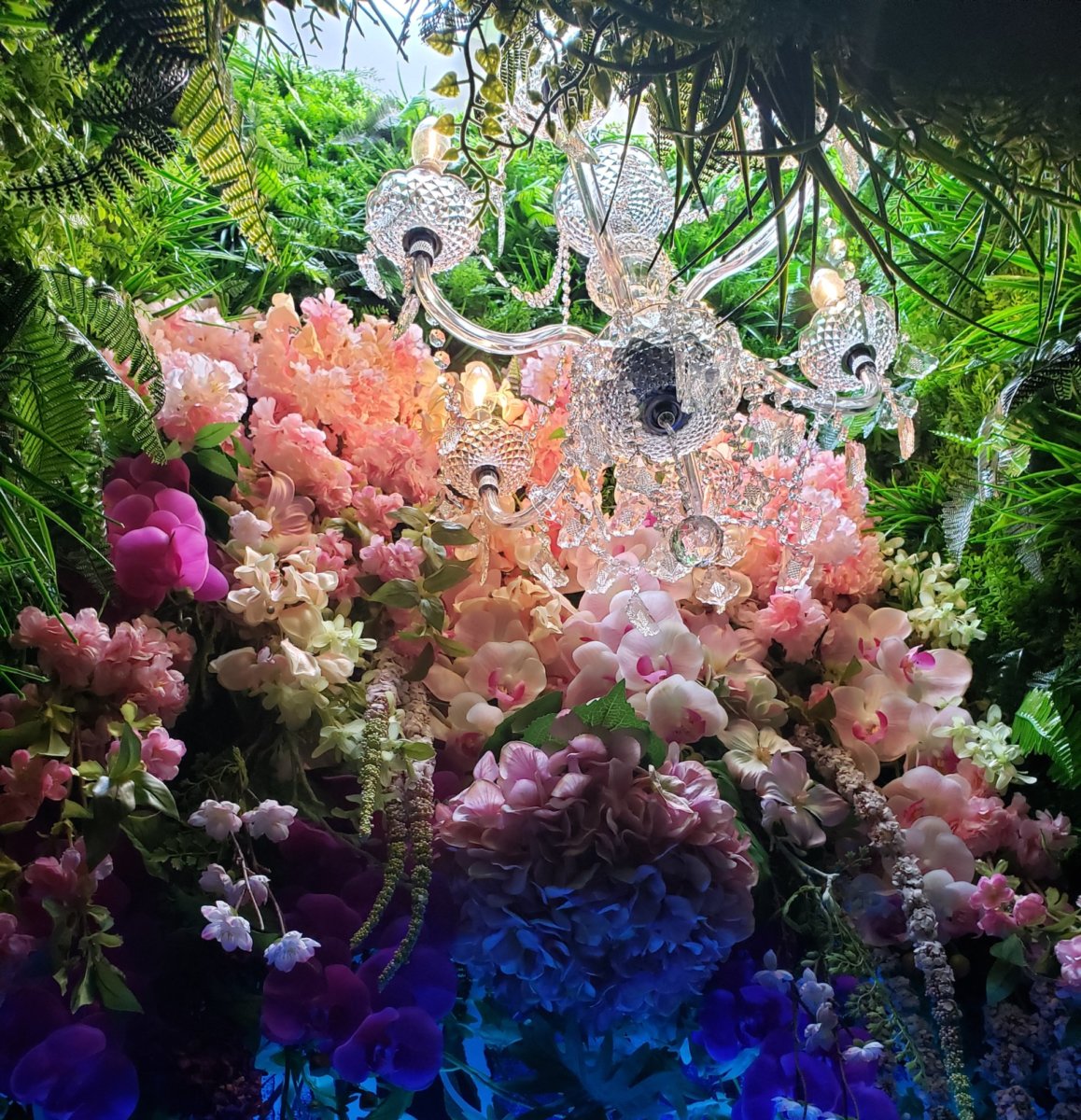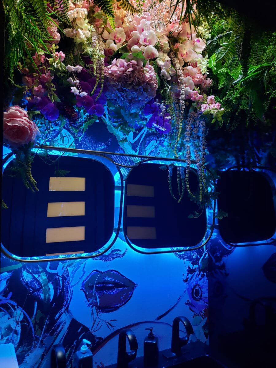 The restaurant has a wall with kings and queens, a love-themed wall, even a gun fight happening from one panel to the other, along with music videos playing on their flat-screen TVs. Flowers and chandeliers also accent the space.