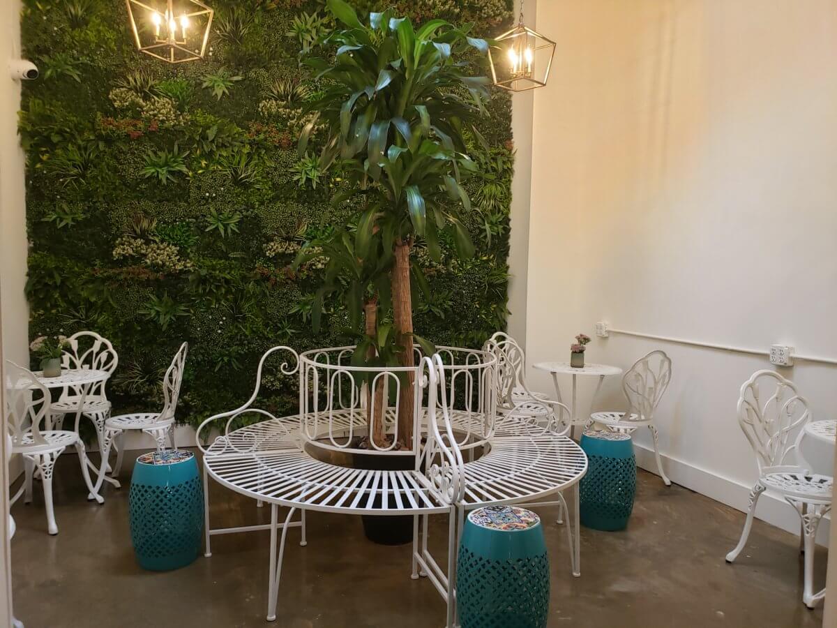 The final result has a living room setting, a seating area among a beautiful flower wall, and a “sunroom” that is designed to look like a garden, complete with flowers, green plants, a fountain with the peaceful sound of flowing water and a skylight.