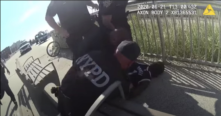 The footage shows him wrapping his arm around the neck of Ricky Bellevue, a 35-year-old Black man, who appears to lose consciousness.