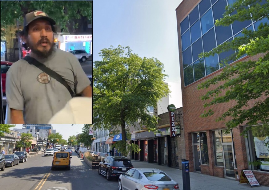 An alleged racist, pictured above, headbutted an Asian American man in an unprovoked attack on Steinway Street Tuesday night (NYPD and GMaps)