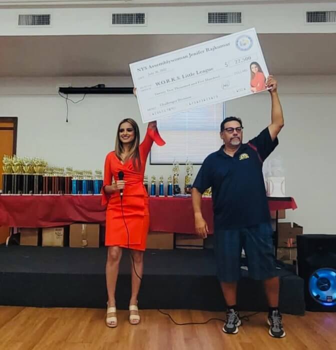State Assemblywoman Jenifer Rajkumar presented a $22,500 check to the W.O.R.K.S. Little League during its 2022 Awards Luncheon at the Deshi Senior Center in Ozone Park on Saturday, July 30.