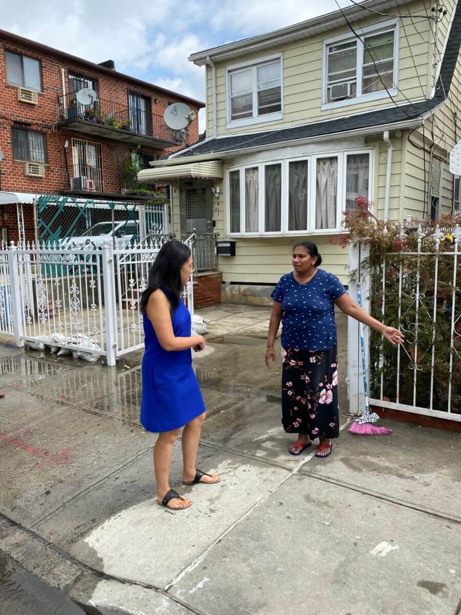 In Flushing, City Councilwoman Sandra Ung checked in with families on Peck Avenue, where three people lost their lives in a flooded basement apartment in last year’s storm.