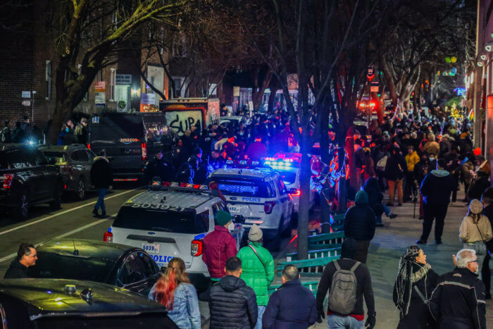 Dozens of police from the 115th Precinct in Jackson Heights struggled to keep the two groups on opposite sides of 81st Street. At one point, a protester wearing a skull bandana to cover his face fired off a Nazi salute before he was led away from the crowd and arrested.