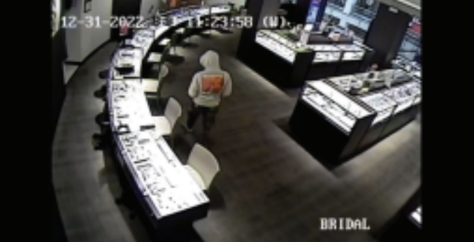 As the store employee opened the glass display case, Frias allegedly pulled out a black handgun from his waistband and pointed it at the store clerk who then backed away from the display case. Frias allegedly jumped over the counter and began shoveling approximately $250,000 of jewelry into a bag, according to prosecutors. The incident was captured on video surveillance from inside the store, which shows Frias wearing distinctive clothing including a light-colored hoodie with a large orange square image on the back, camouflage pants, gray and white sneakers, a mask and orange gloves.