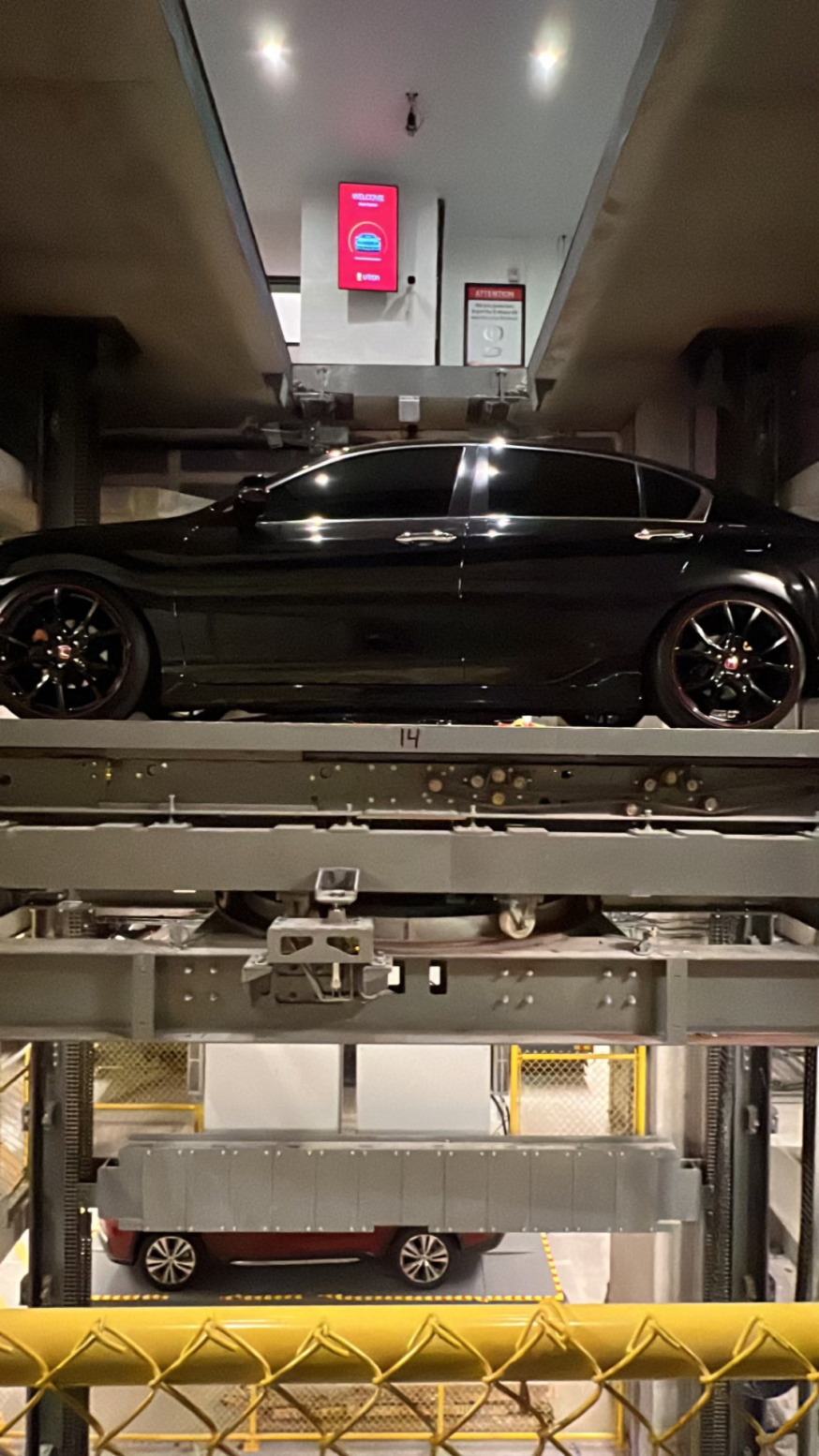 The vehicle is then transferred via the platform to its designated parking space via an automated lift.
