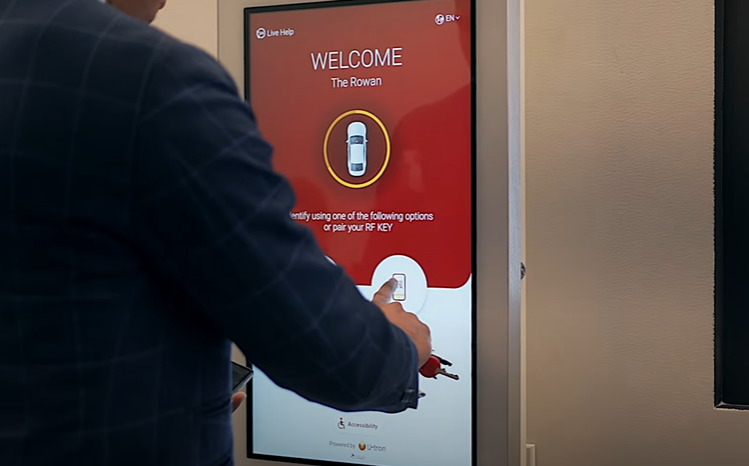 Drivers then use an app or an electronic ticket system at a kiosk to request and retrieve their vehicle. The automated mechanism then returns the car to one of two parking bays at the garage. The bays are located at the rear of The Rowan.