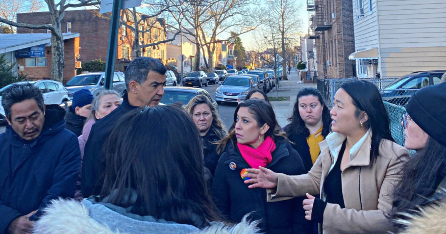 The city’s Dept. of Transportation (DOT) Commissioner Ydanis Rodriguez (L), in March, visiting the intersection where 7-year-old Dolma Naadhun was fatally struck (Photo via Twitter @CMJulieWon)