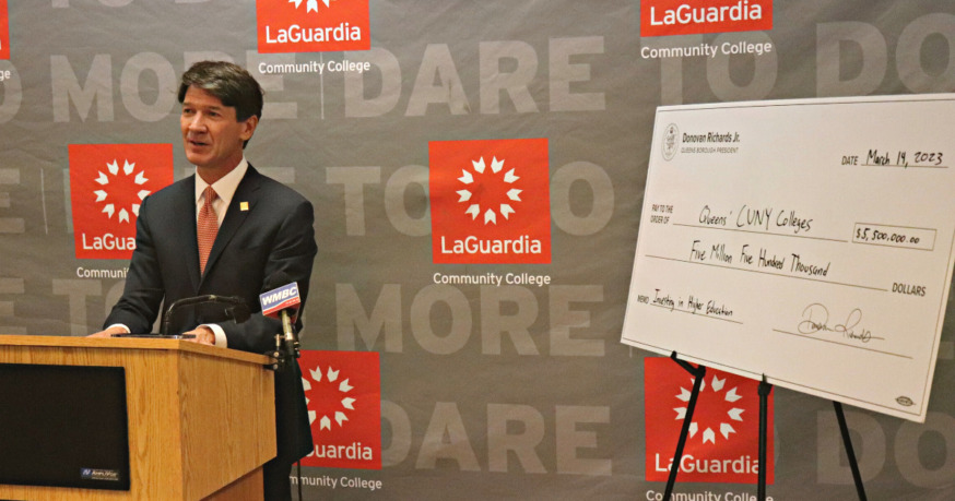 The presentation was made by Queens Borough President Donovan Richards, whose office allocated the funds to LaGuardia Community College, Queens College, Queensborough Community College and York College. The funds will go toward financing various projects at the institutions including building renovations, training facility upgrades, and security purposes.