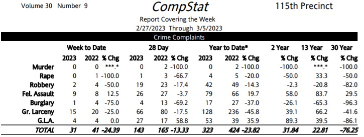 There was a total of four hate crime incidents reported in the 115th Precinct last year, down one from 2021, while the neighboring 110th Precinct reported eight hate crime complaints in 2022, up 3 from 2021, according to the NYPD’s hate crime database. Meanwhile, there have been 79 felony assaults in the 115th Precinct so far this year, a 19.7 percent increase compared to the same period last year, NYPD data shows.