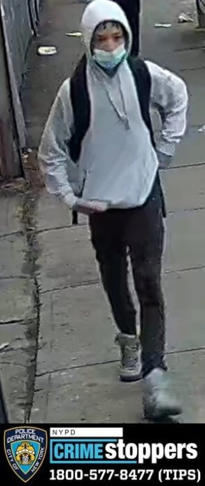 The NYPD released surveillance images of the suspected mugger and described him as having a medium complexion and approximately 15 or 16 years old. In one photo he was wearing a black hooded winter jacket, a blue face mask, black pants, white sneakers and a black backpack. In the second image, the suspect was seen wearing a gray hoodie, black pants, white sneakers, a blue face mask and a black backpack.