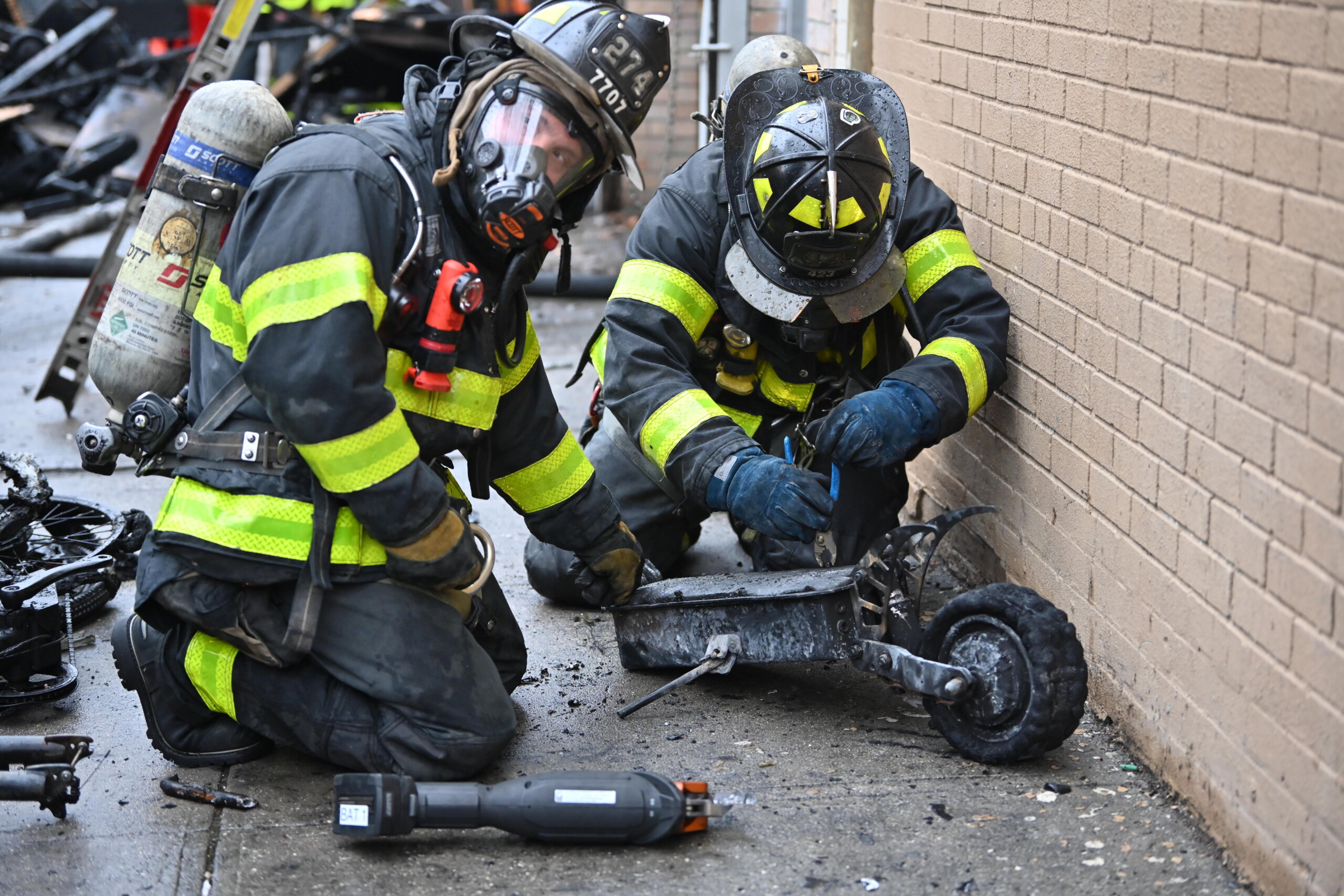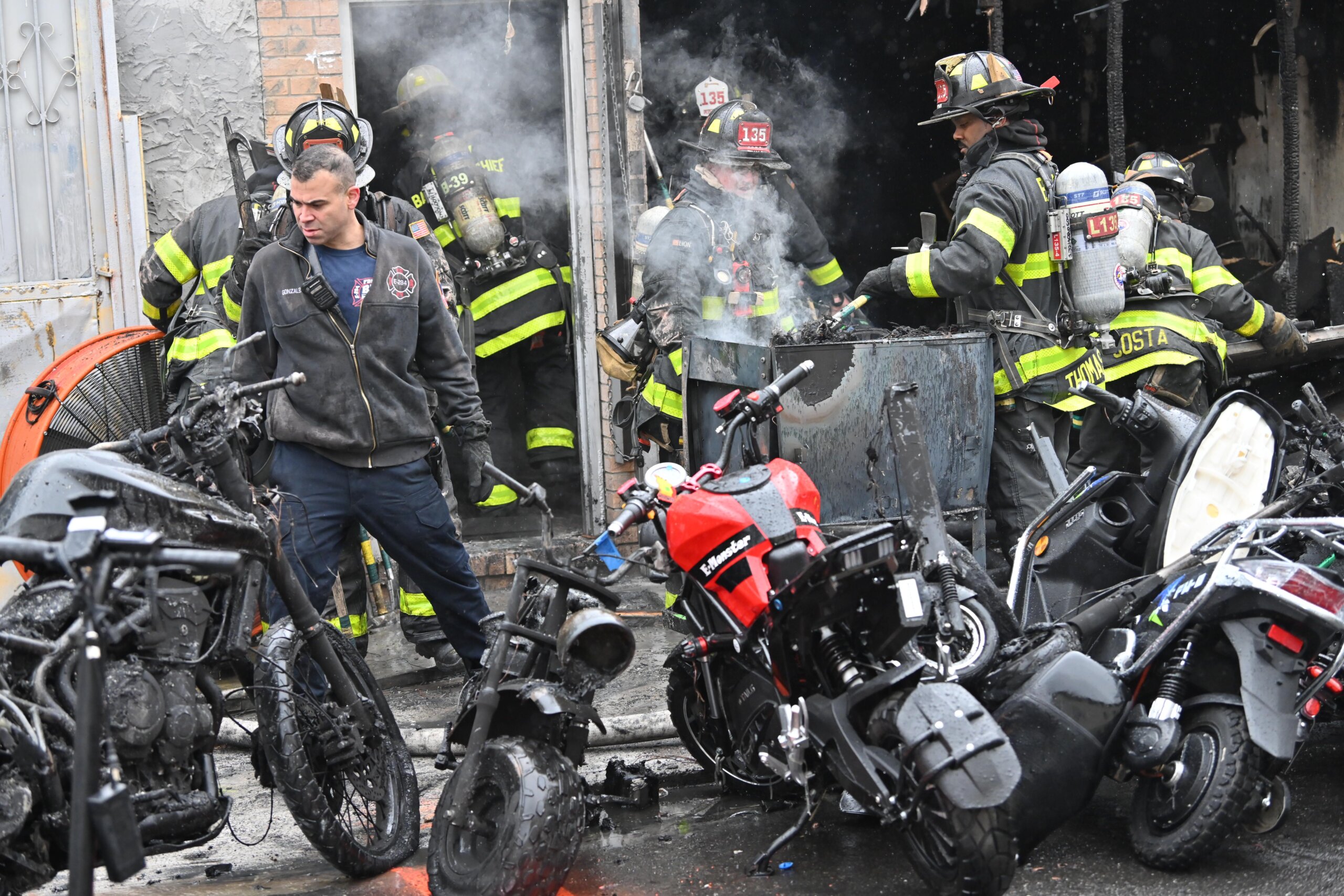 Between 85 to 100 e-bikes, scooters, and motorcycles were removed from the shop that had signs of fire damage. Firefighters were still trying to remove 20 or more e-bikes and scooters from the cellar.