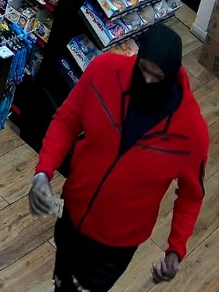 The NYPD released surveillance video of the suspect on Friday that shows him inside the mini-mart and described him as an adult man with a large build. He was last seen wearing a red hooded sweatshirt, black pants and black sneakers.