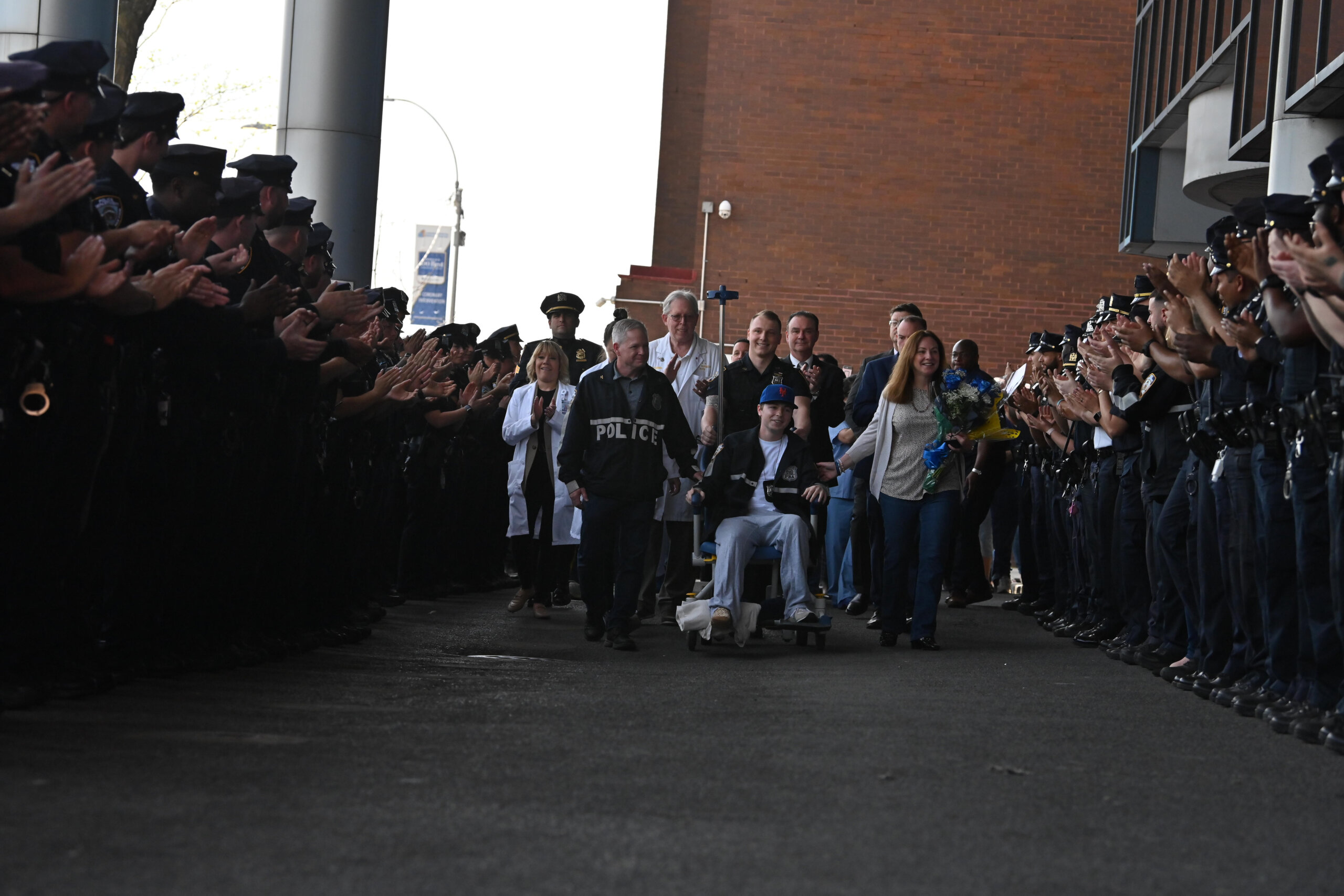A wall of blue erupted into cheers and applause as NYPD Police Officer Brett Boller was released from Jamaica Hospital Medical Center on April 14, nine days after he was shot in the line of duty.