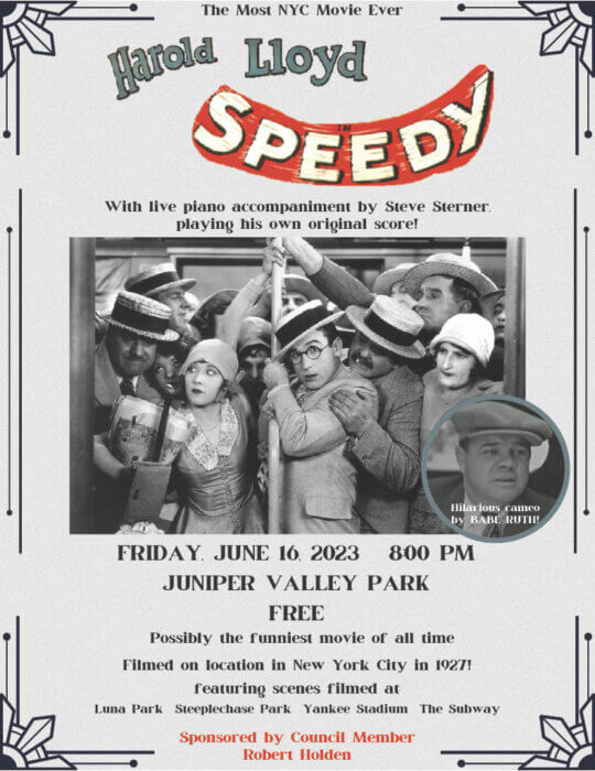Councilman Robert Holden plans to send Middle Village into The Roaring Twenties with a free screening of the silent film, “Speedy,” along with a live piano performance, at Juniper Valley Park on Friday, June 16.