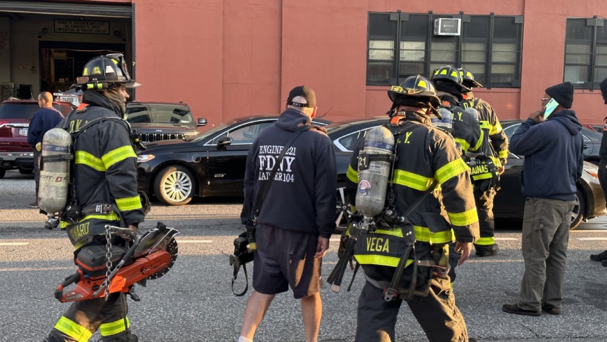 Around 60 firefighters from 12 units responded to the scene and brought the blaze under control just after 7:30 a.m., the FDNY said. At least two tower ladder trucks were put into operation, the footage shows.