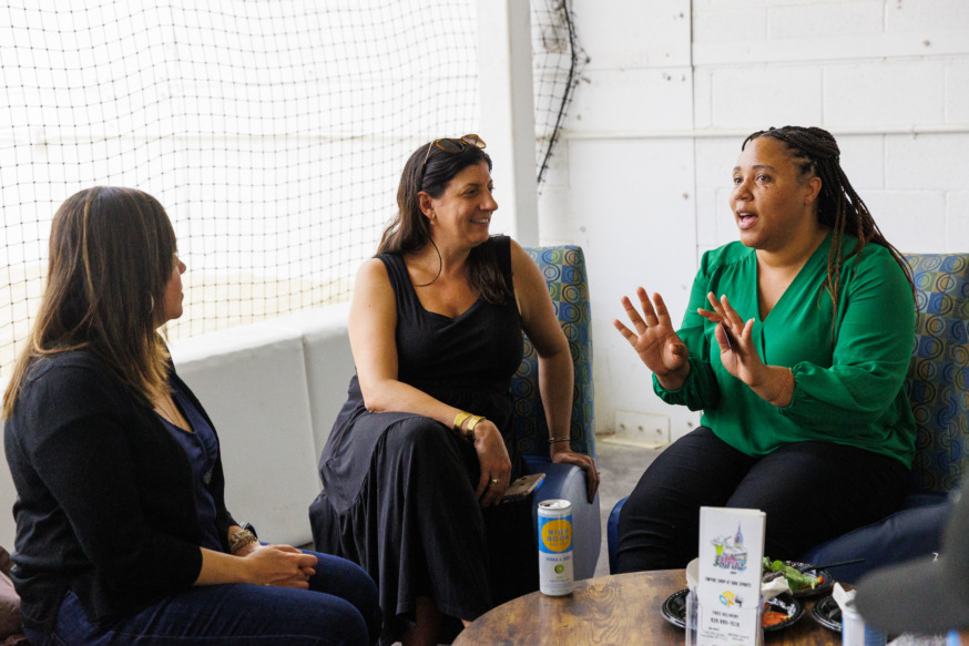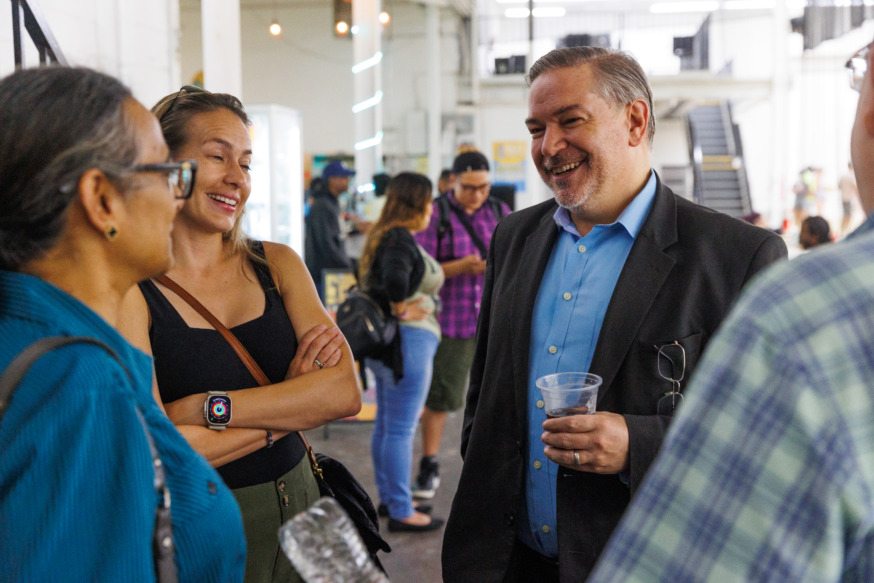 Council member Julie Won (l.) speaking to Davi Moundros (center), and Pete Moundros (r.) at the launch party (Photo by Paul Frangipane)