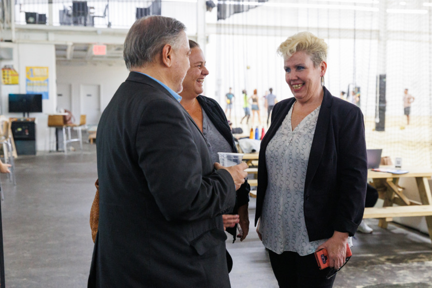 Council member Julie Won (l.) speaking to Davi Moundros (center), and Pete Moundros (r.) at the launch party (Photo by Paul Frangipane)