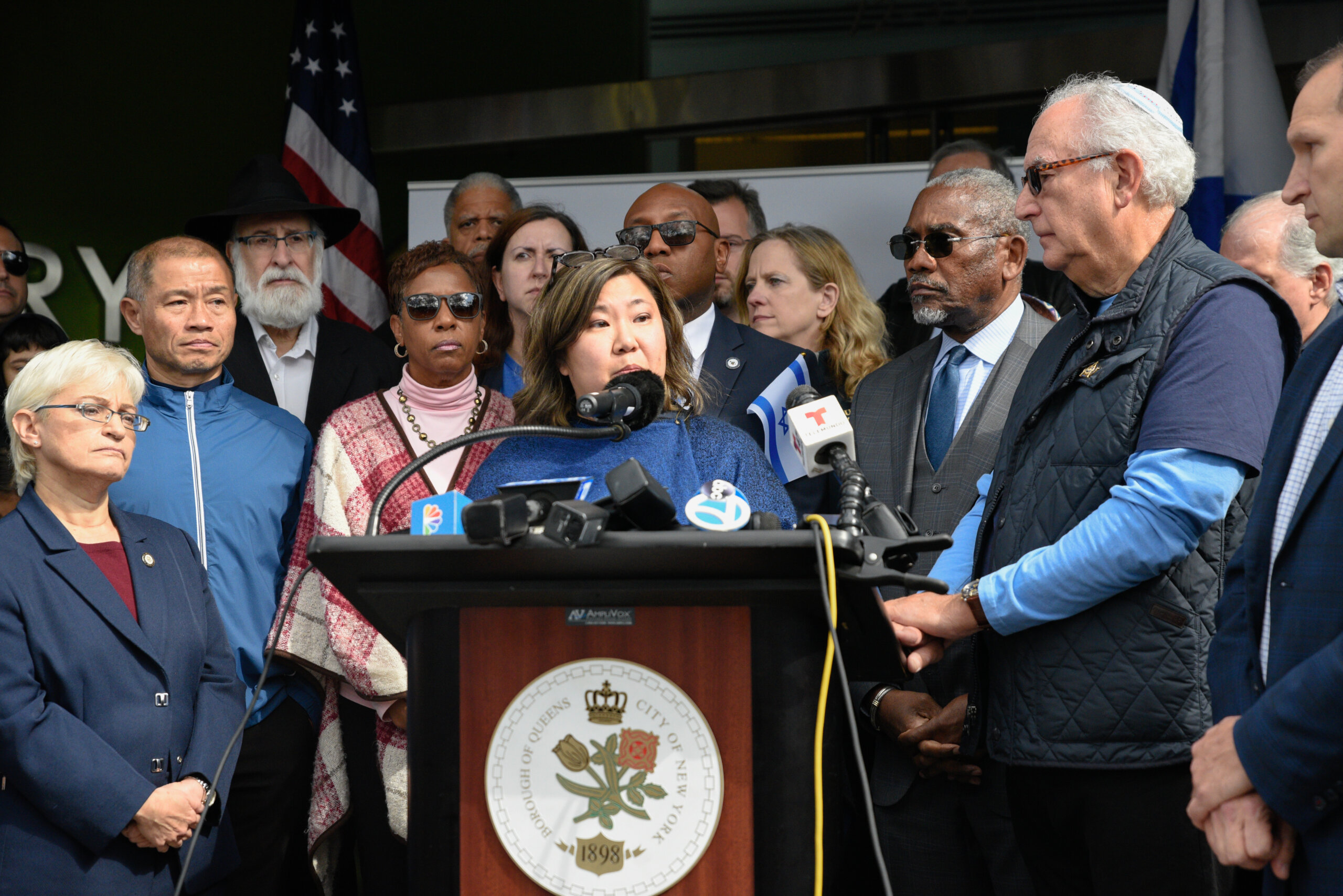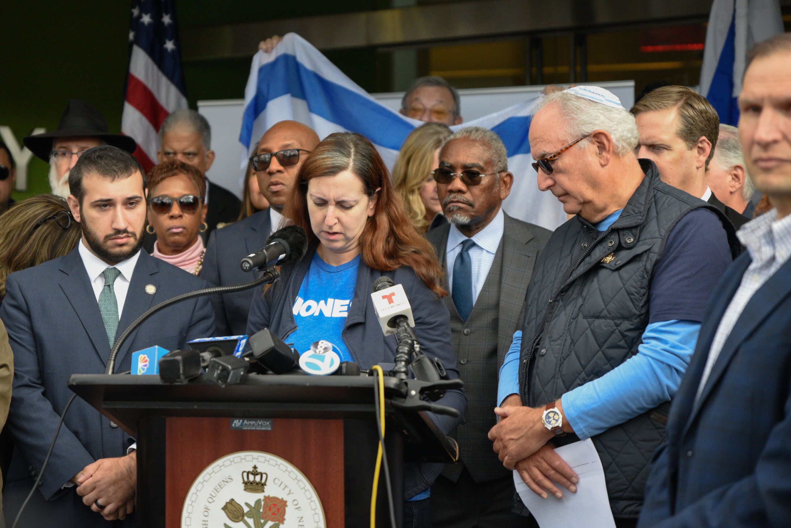 “We’ve been in front of this library in this neighborhood, standing up for Israel so many times,” said Queens District Attorney Melinda Katz, who is Jewish. “There’s gonna come a day when we don’t have to gather here, that the world knows that Israel has a right to defend itself. And then Israel knows that it has a right to live free.”