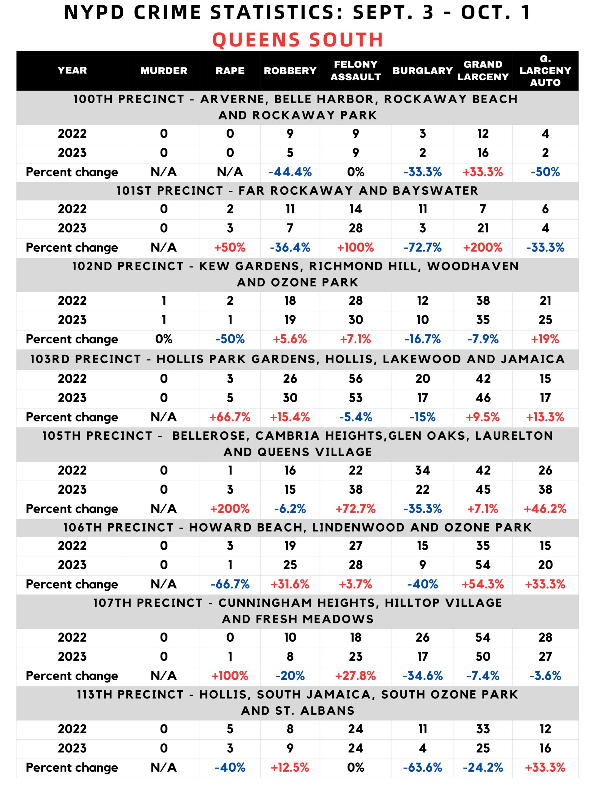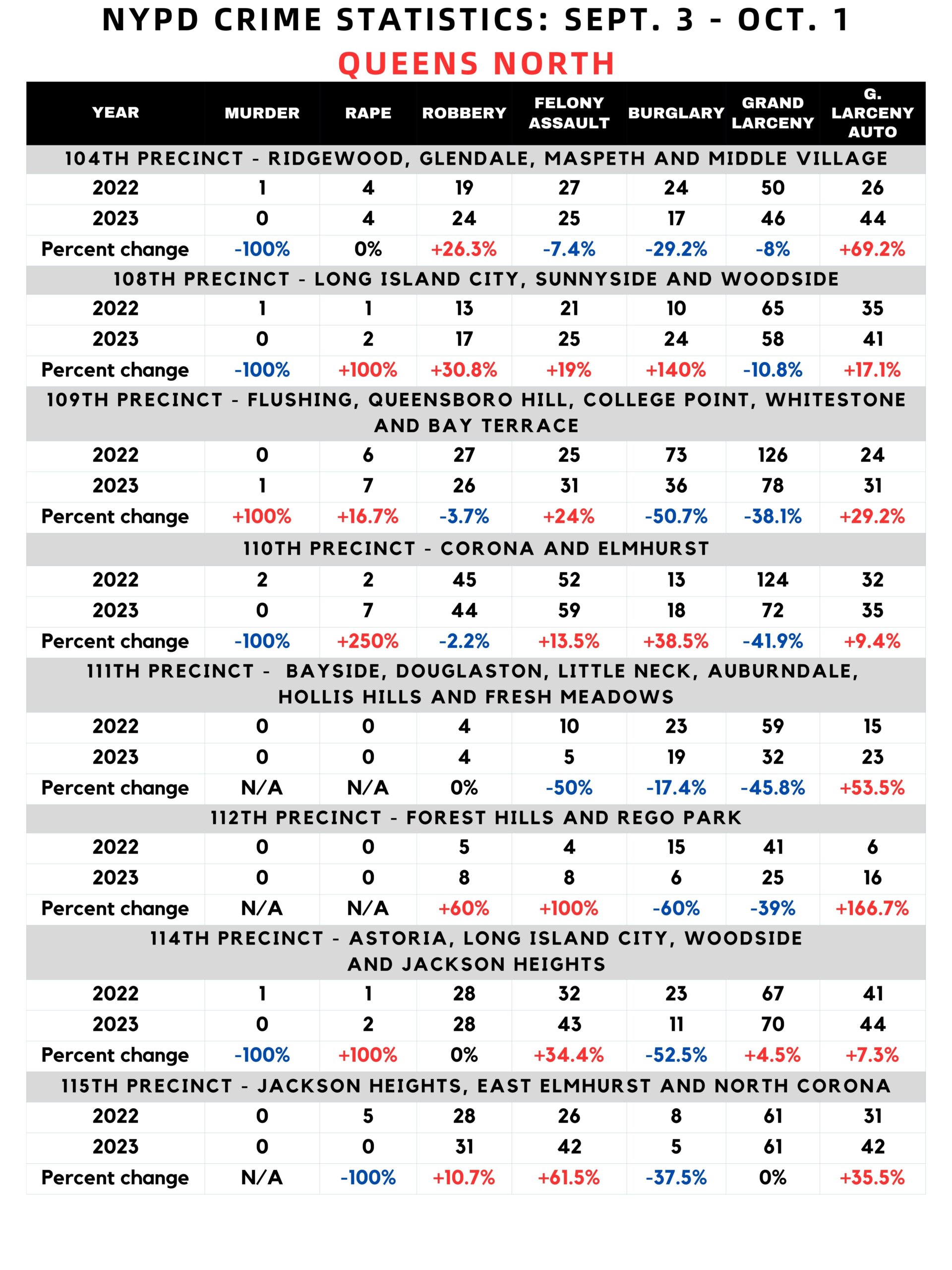 The NYPD released crime stats for Sept. 3 to Oct. 1 in northern and southern Queens, comparing the number of cases in each precinct to the same 28-day period last year. The differences varied based upon the type of crime and which precinct.