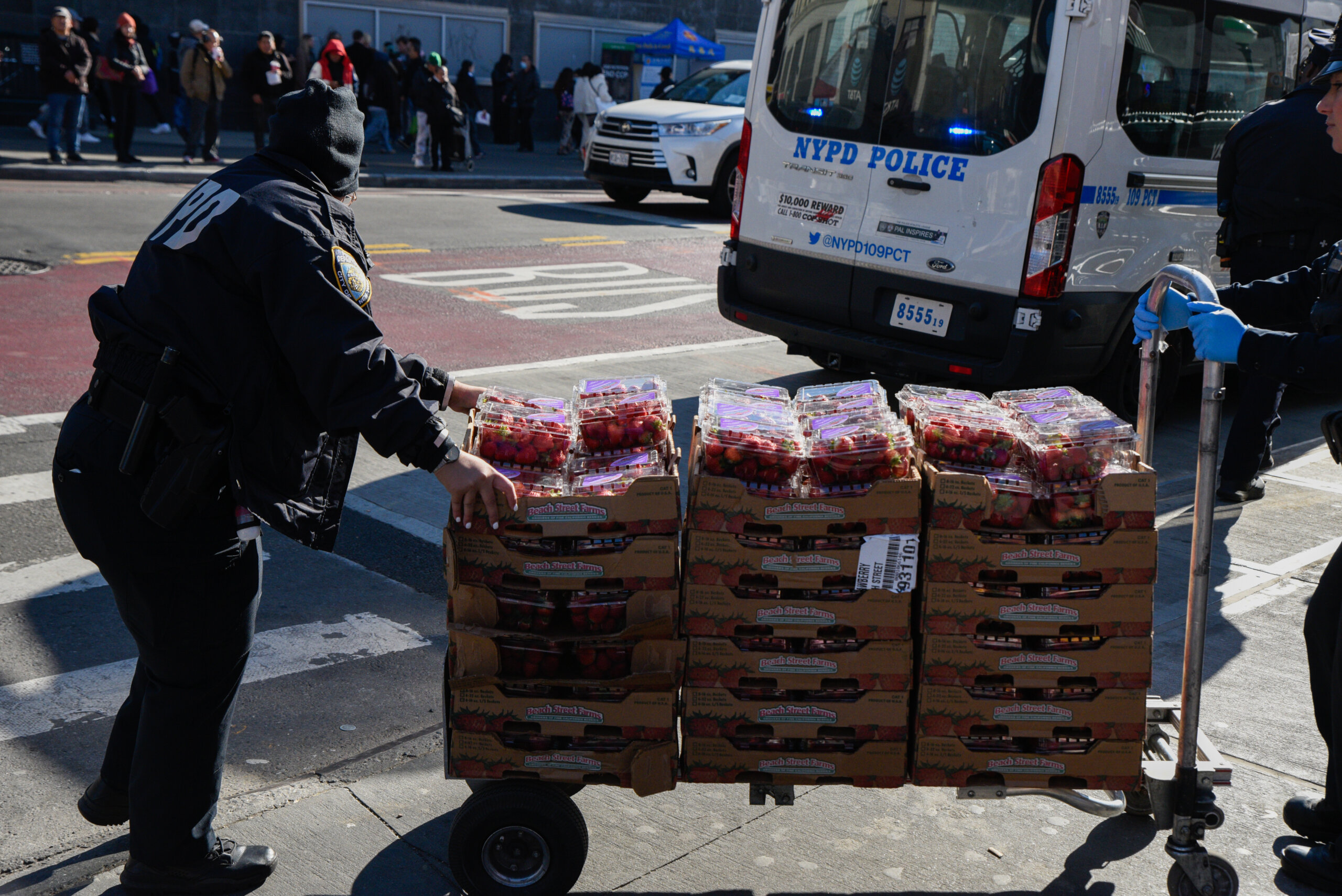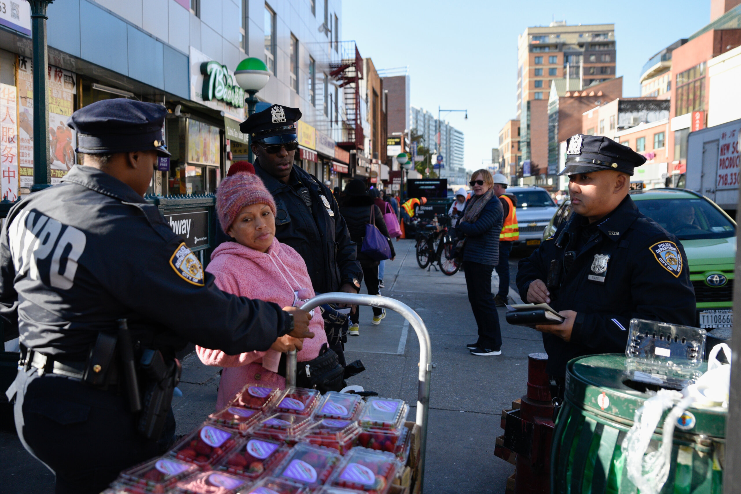 Not long after Caban left, an illegal street vendor who was selling fruit at the corner of Main Street and Roosevelt Avenue had stacks of strawberries confiscated by police after they confirmed she was selling without a license.
