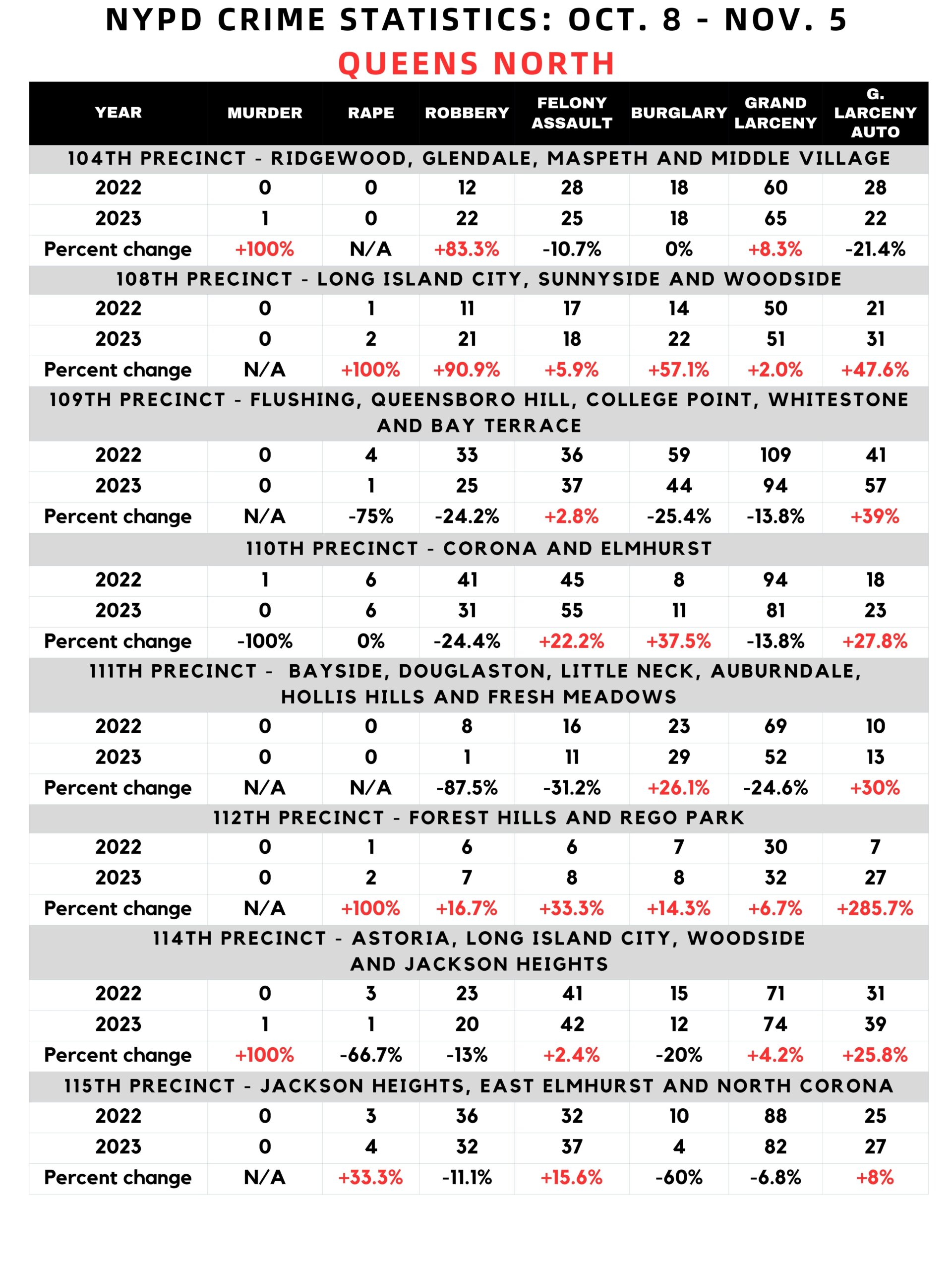 Despite the decrease in murders, northern Queens has still seen a 6.4% increase this year compared to last year in major crimes — murder, rape, robbery, felony assault, burglary, grand larceny and grand larceny of automobiles — from a total of 13,248 in 2022 to 14,097 this year.