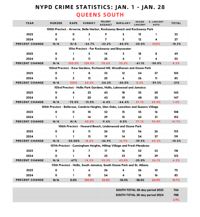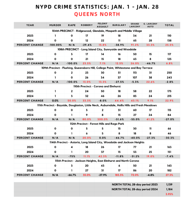 During the 28-day period from Jan. 1-28, the total number of major crimes increased 3.95% in northern Queens, from 1,139 over that time span in 2023 to 1,184 this year. In southern Queens, there was a 2.87% increase, from 766 to 788. The major crimes factored into these totals are murder, rape, robbery, felony assault, burglary, grand larceny and automobile theft.