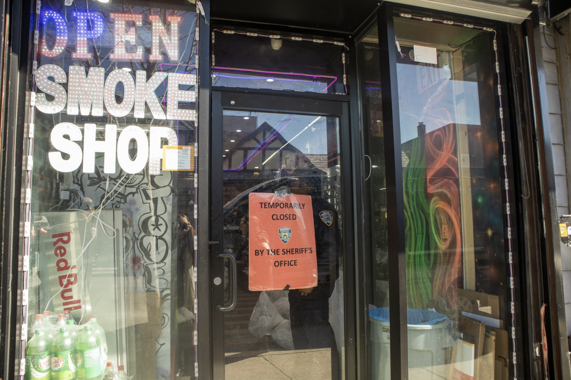Several illegal smoke shops in College Point and Whitestone were busted Tuesday by the NYC Sheriff’s Department.