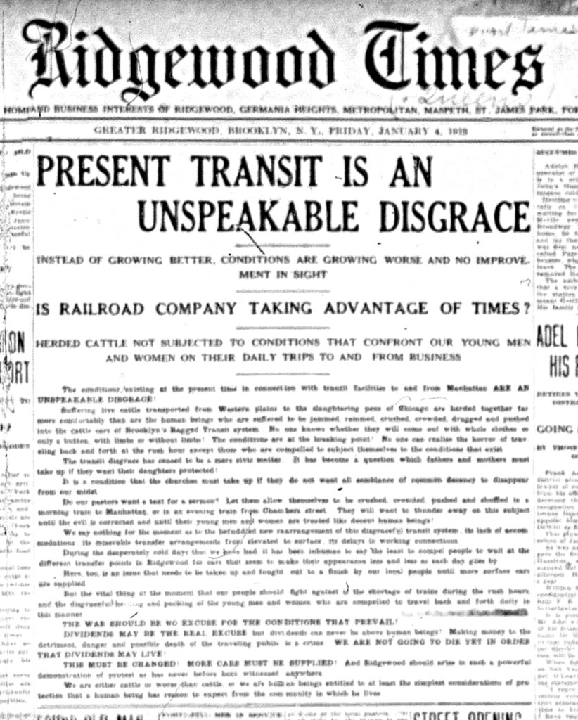An editorial on the front page of Jan. 4, 1918 Ridgewood Times put it bluntly with the headline: PRESENT TRANSIT IS AN UNSPEAKABLE DISGRACE. A subheadline below noted that, “Instead of getting better, conditions are growing worse, and no improvement in sight.”