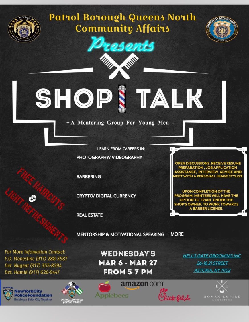 Patrol Borough Queens North Community Affairs is hosting Shop Talk, a mentoring group for teenage boys, at Hell Gate Grooming barber shop at 26-18 21 Street in Astoria.