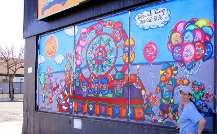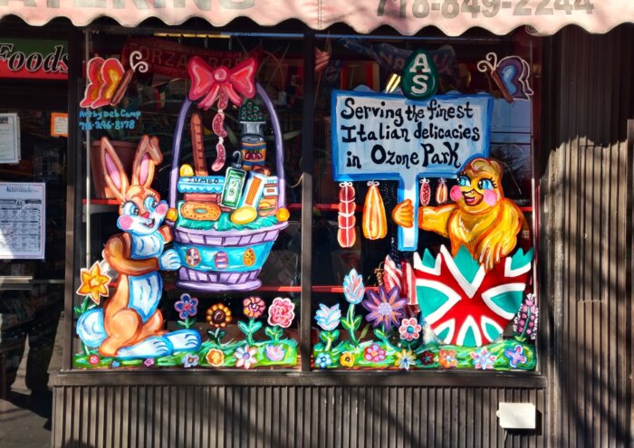 She’s very proud of her most recent project, a large Easter mural for A&S Italian Pork Store in Ozone Park. Camp enjoys incorporating aspects of a given business into her artwork. For instance, the mural pulls elements from the butcher store along with the Easter Bunny and an Easter chick.
