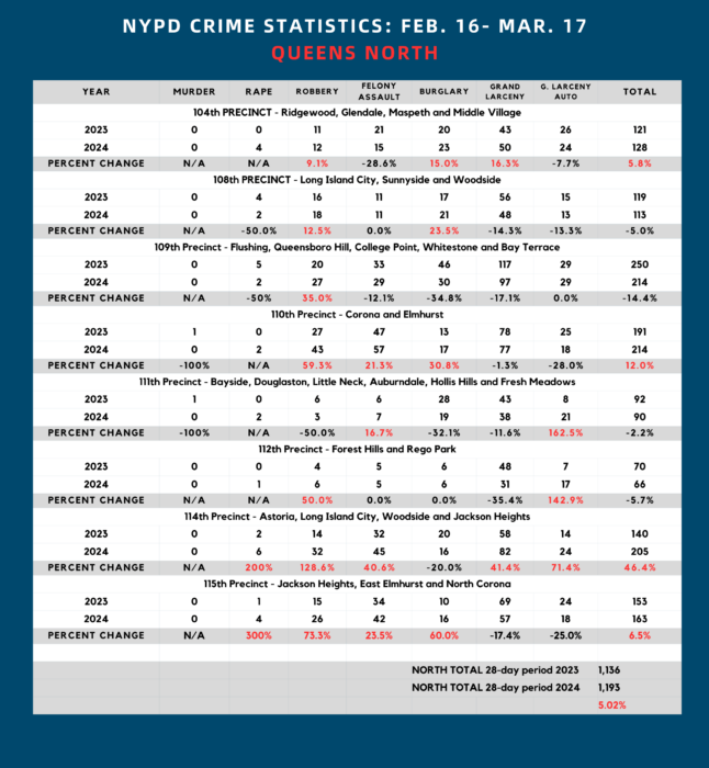 The total number of reported major crimes – murder, rape, robbery, felony assault, burglary, grand larceny and vehicle thefts – barely had any change across both northern and southern Queens during the 28-day period. Major crimes in northern Queens ended up decreasing from 1,192 to 1,184. In southern Queens, major crimes went down from 767 to 758.