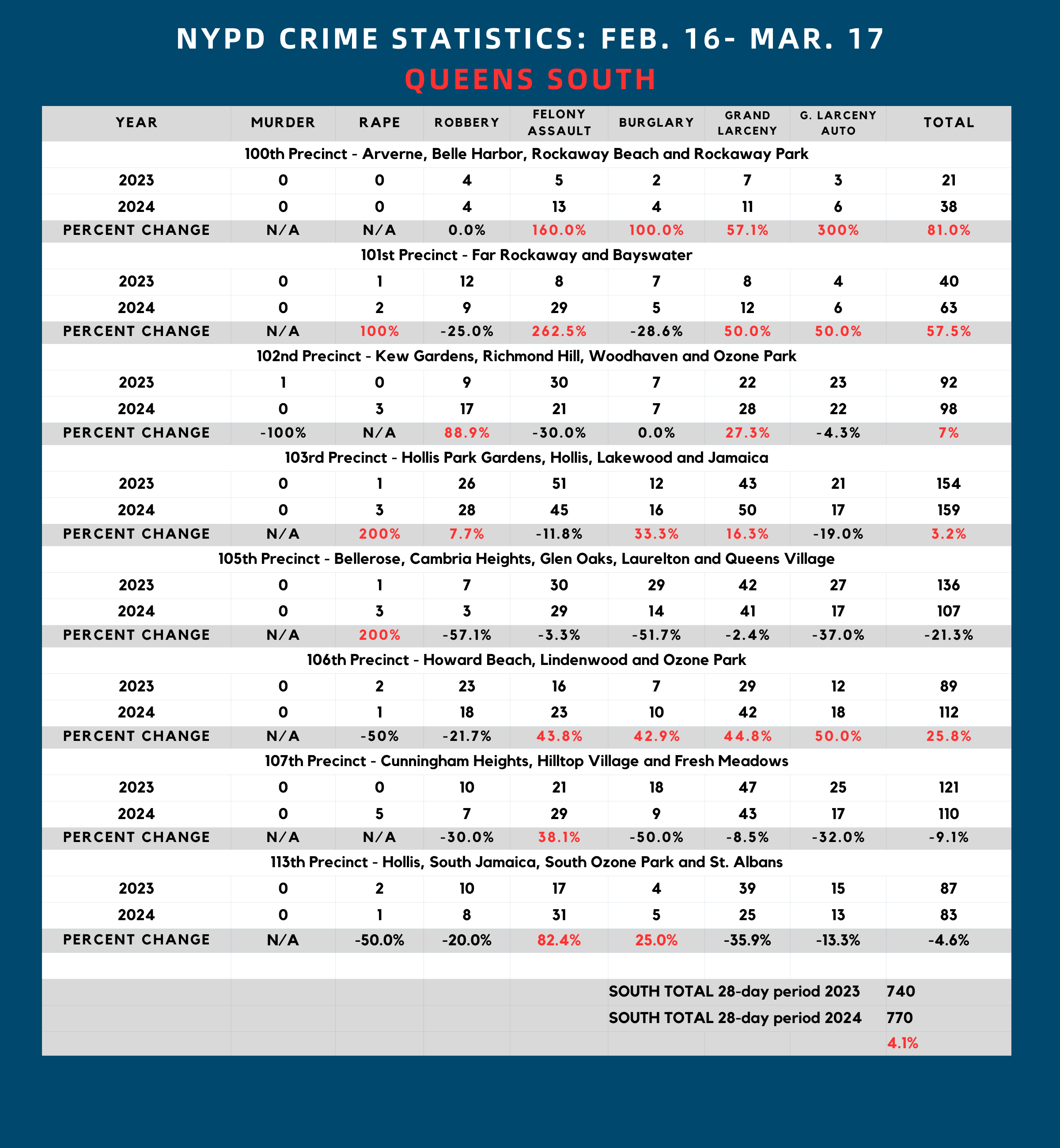 The total number of reported major crimes – murder, rape, robbery, felony assault, burglary, grand larceny and vehicle thefts – rose across the borough during the 28-day period, compared to the same time last year. Major crimes in northern Queens increased 5.02% over that span, from 1,136 to 1,193. In southern Queens, there was a 4.05% increase in major crimes during the same period of time, from 740 in 2023 to 770 in 2024.