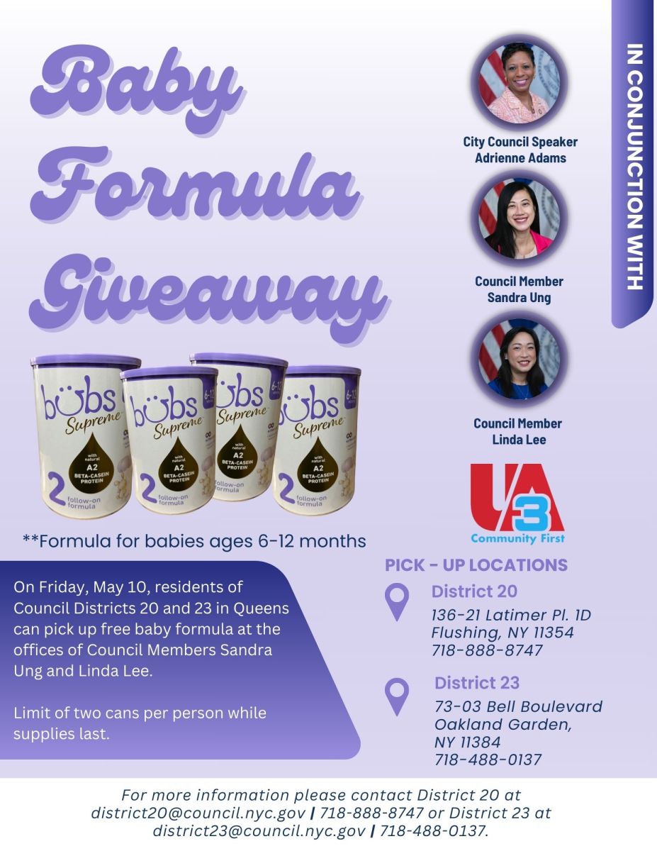 Council Members Sandra Ung (D-20) and Linda Lee (D-23) are giving away free baby formula to Flushing and Oakland Gardens residents on Friday, May 10, between 10 a.m. and 3 p.m.