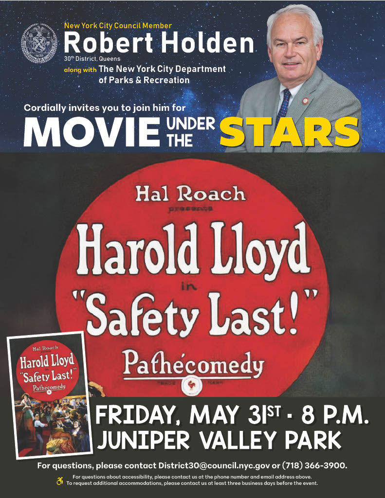- On Friday, May 31, Harold Lloyd in “Safety Last!” (a classic silent movie) will be played at Juniper Valley Park, in Middle Village.