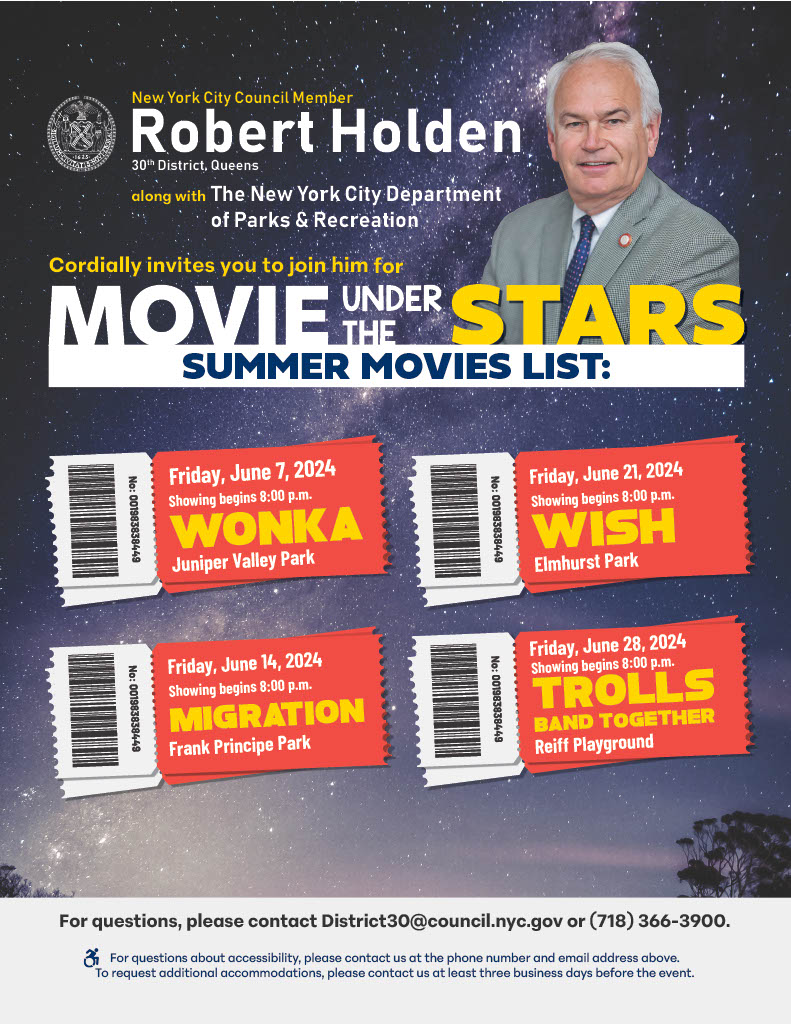 Queens Council Member Robert Holden is bringing family movie nights back to Middle Village and Maspeth parks this summer for his annual Movies Under the Stars series.