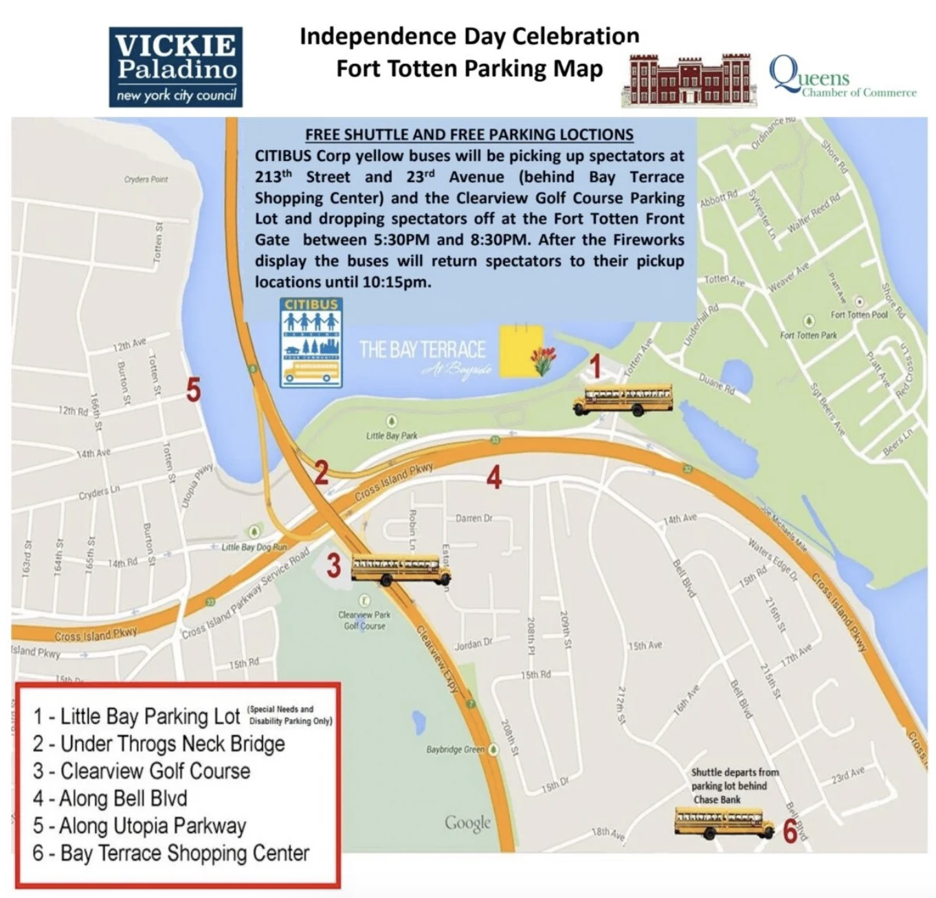 Visitors are encouraged to walk or take advantage of the shuttle to transport them to and from offsite parking, as it will be limited to handicapped attendees at Little Bay Park. Citibus will offer shuttles from Clearview Golf Course and Bay Terrace Shopping Center, where parking will be available.