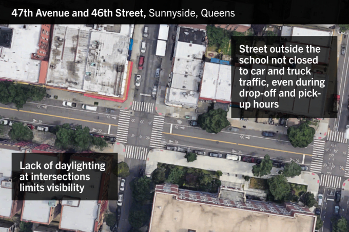 Photo of the dangerous intersection at 47th Avenue and 46th Street near I.S. 125 in Woodside. Photo courtesy of Transportation Alternatives