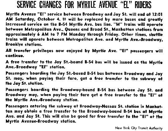 Ronan, however, noted that the declining ridership made it a losing proposition to continue. “In addition to operating savings and increased revenue from the bus service” that would replace it, he reportedly said, “demolition of the elevated structures will open a 35-block stretch of Myrtle Avenue to light and air.”