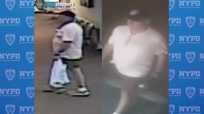 The NYPD released a surveillance video of the suspect on Monday and described him as having a heavy build and a light complexion. He wore a black baseball cap, a light pink polo shirt and khaki shorts and was carrying a white plastic bag.