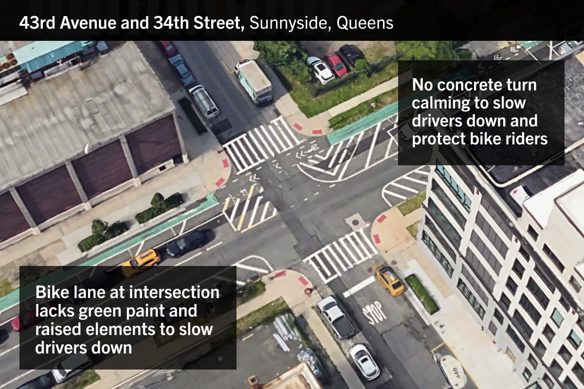 Transportation Alternatives, which advocated for the bike lanes, noted that while the rider was riding in the protected bike lane, the intersection was unprotected, with green paint ending at crossings with no raised elements, leaving cyclists still vulnerable to turning vehicles.