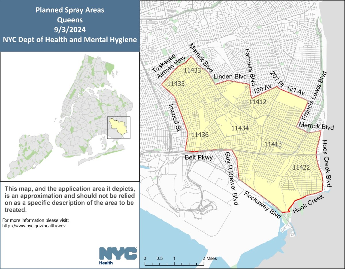 The Health Department will spray pesticides in southeast Queens today to reduce the mosquito-carried West Nile Virus risk.