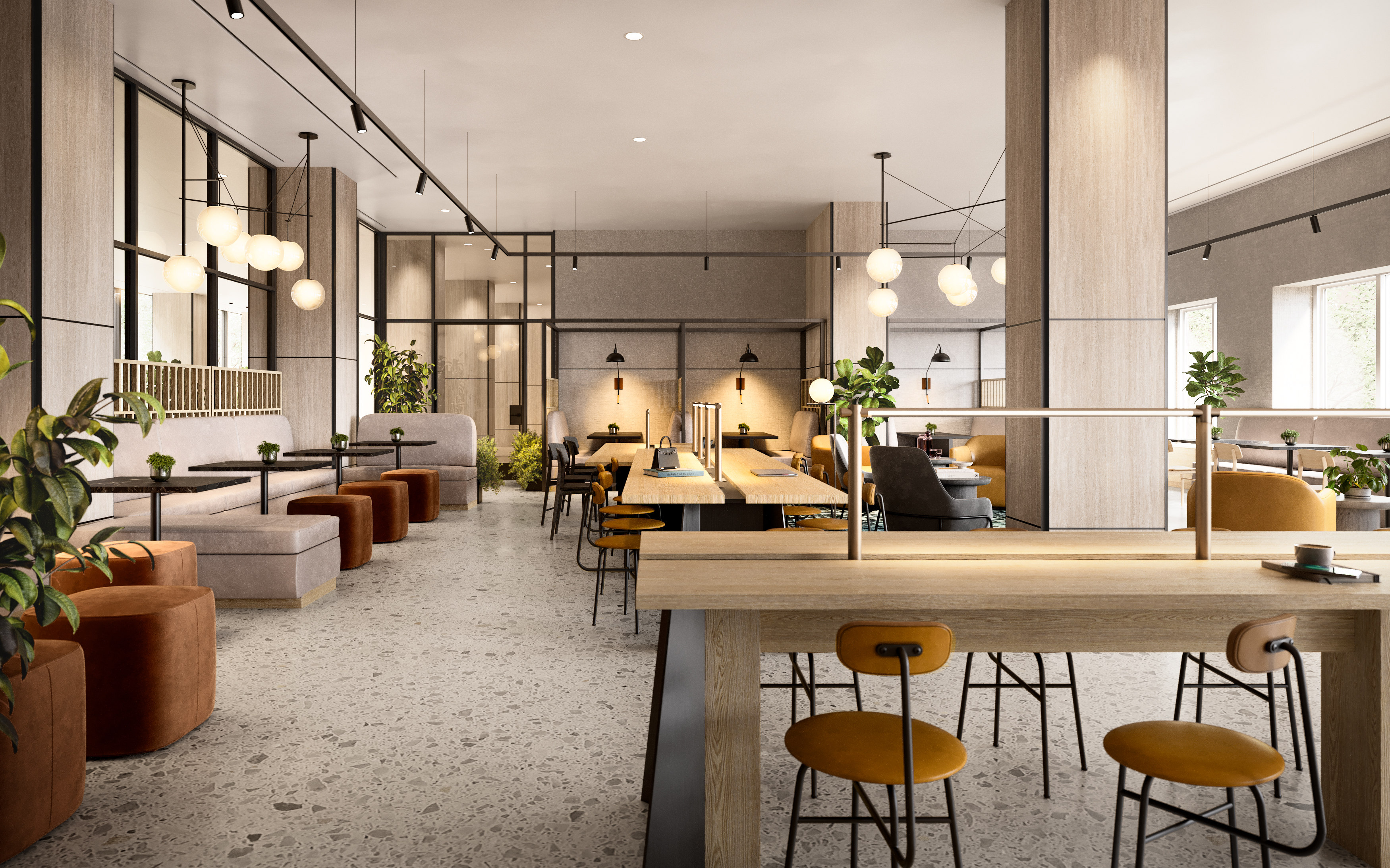 The development’s retail component features 25,000 square feet of space along Second Street inspired by the Meatpacking District. This includes storefronts that open to the public sidewalk, overhead industrial marquees and outdoor seating. Among the new new leases TF Cornerstone signed for the site are JoJo and Co. Pet Club and Stepping Stone Cafe, which offers food and drinks made by the popular Maman brand, at the base of the South building. Additionally, the Asian eatery FER Restaurant and sundays Studio, a high-end salon specializing in non-toxic nail care and self-care experiences, are new leases signed for the base of the North building.