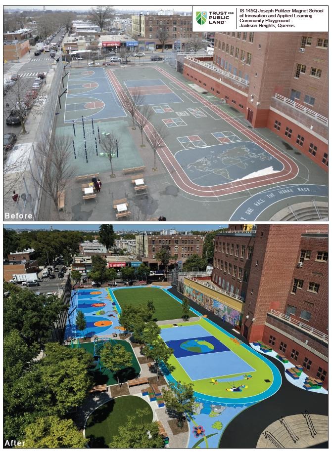 “Climate change is bringing more intense rainstorms that can overwhelm our sewers, and Green Infrastructure playgrounds like the one at I.S. 145 are crucial to our efforts to reduce flooding around the five boroughs,” New York City Chief Climate Officer and Department of Environmental Protection Commissioner Rohit T. Aggarwala said. “Thank you to our partners at The Trust for Public Land for their hard work, to Borough President Richards and Council Member Krishnan for their leadership and to all the students who helped design this wonderful new playground.”