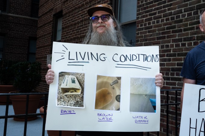 “We need to get timely responses and proper repairs made to our apartments so that we can continue to live in our apartments and do not have to worry about moving out because our entire bathroom ceiling fell and there was a mold in there, or that our living room apartment ceiling fell on our heads,” the tenant said, drawing chants of “no repair, no rent” from the crowd.