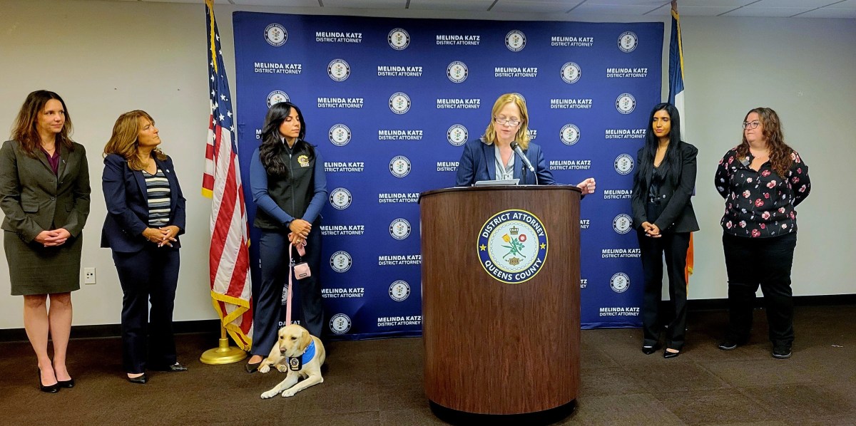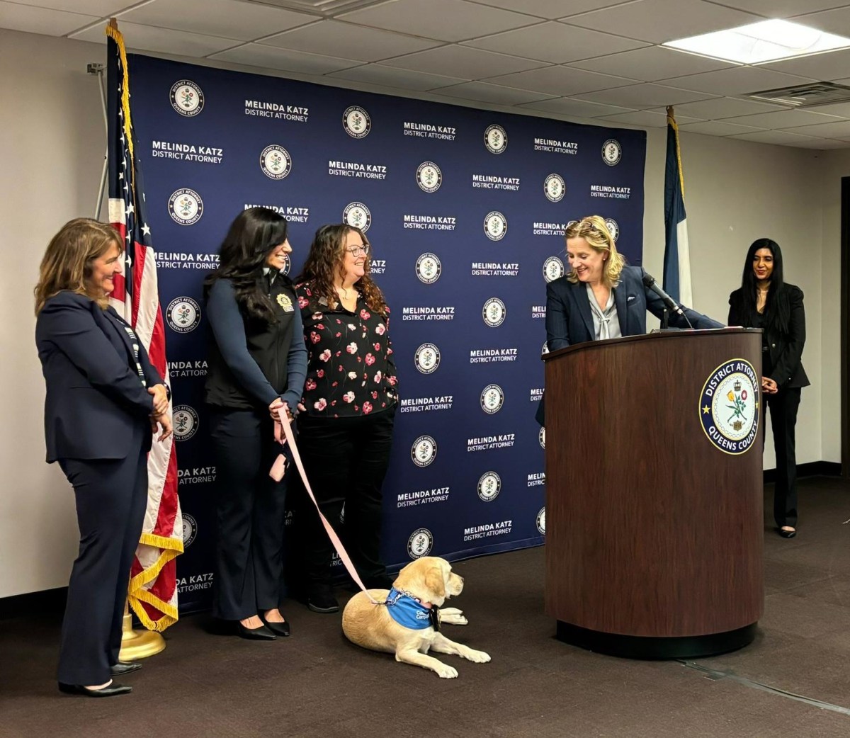 Queens District Attorney Melinda Katz introduced one of the newest members of her team on Wednesday as part of her office’s public information campaign during Domestic Violence Awareness Month.