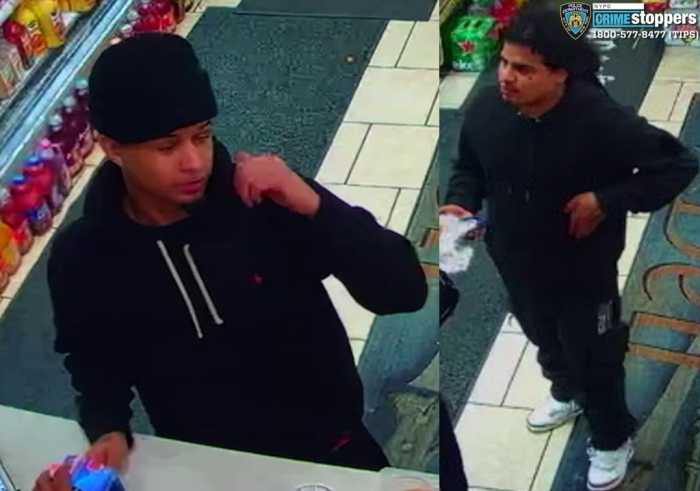 The NYPD released surveillance images of the two attackers and described one as having a light complexion and wearing a black hooded jacket. His accomplice is described as having a medium complexion and wearing a black hooded jacket and a green baseball cap backward.