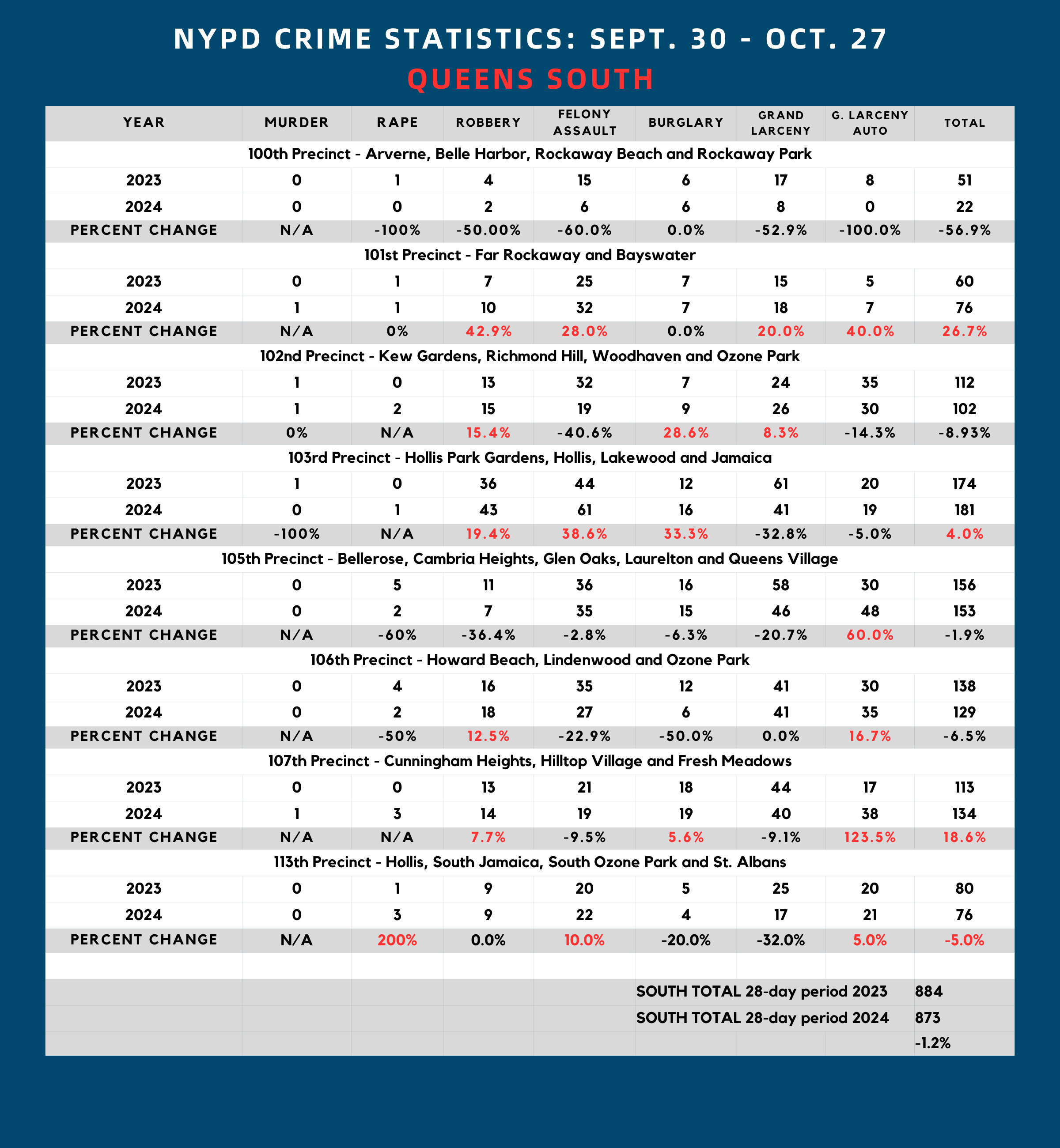 Year-over-year, the total number of reported major crimes for the 28-day period ending Oct. 27 – murder, rape, robbery, felony assault, burglary, grand larceny and vehicle thefts – ended up decreasing across both northern and southern Queens, albeit only very slightly in the latter case.