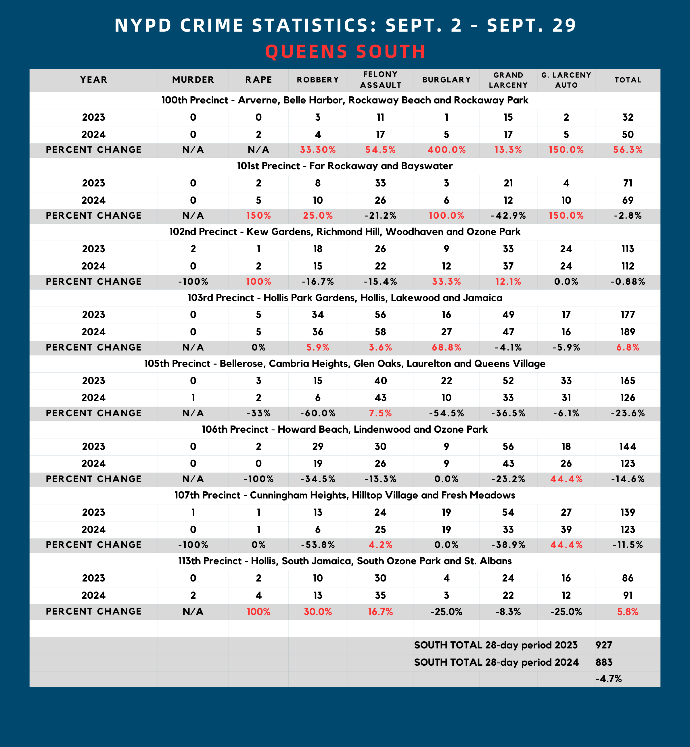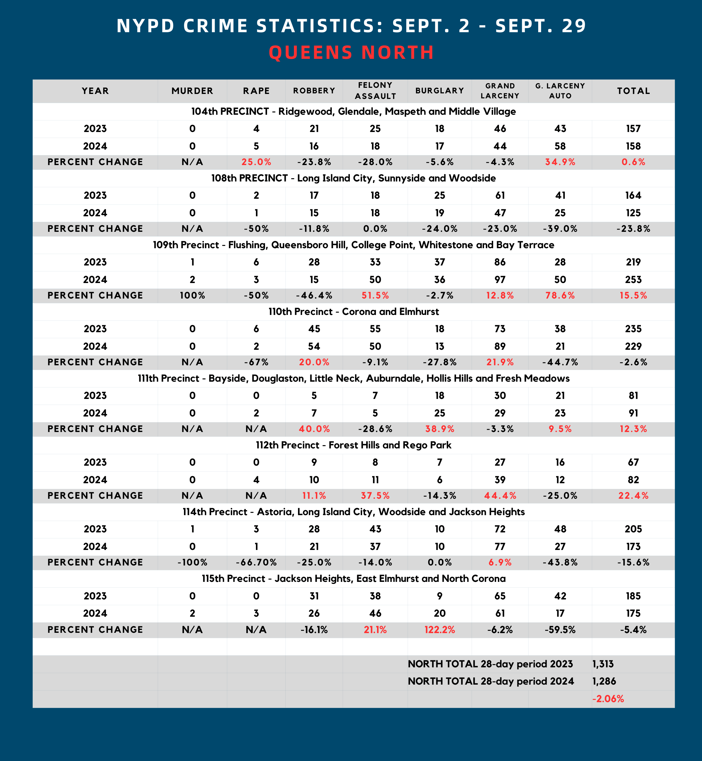 Year-over-year, the total number of reported major crimes for the 28-day period ending Sept. 29 – murder, rape, robbery, felony assault, burglary, grand larceny and vehicle thefts – ended up going down in both northern and southern Queens.